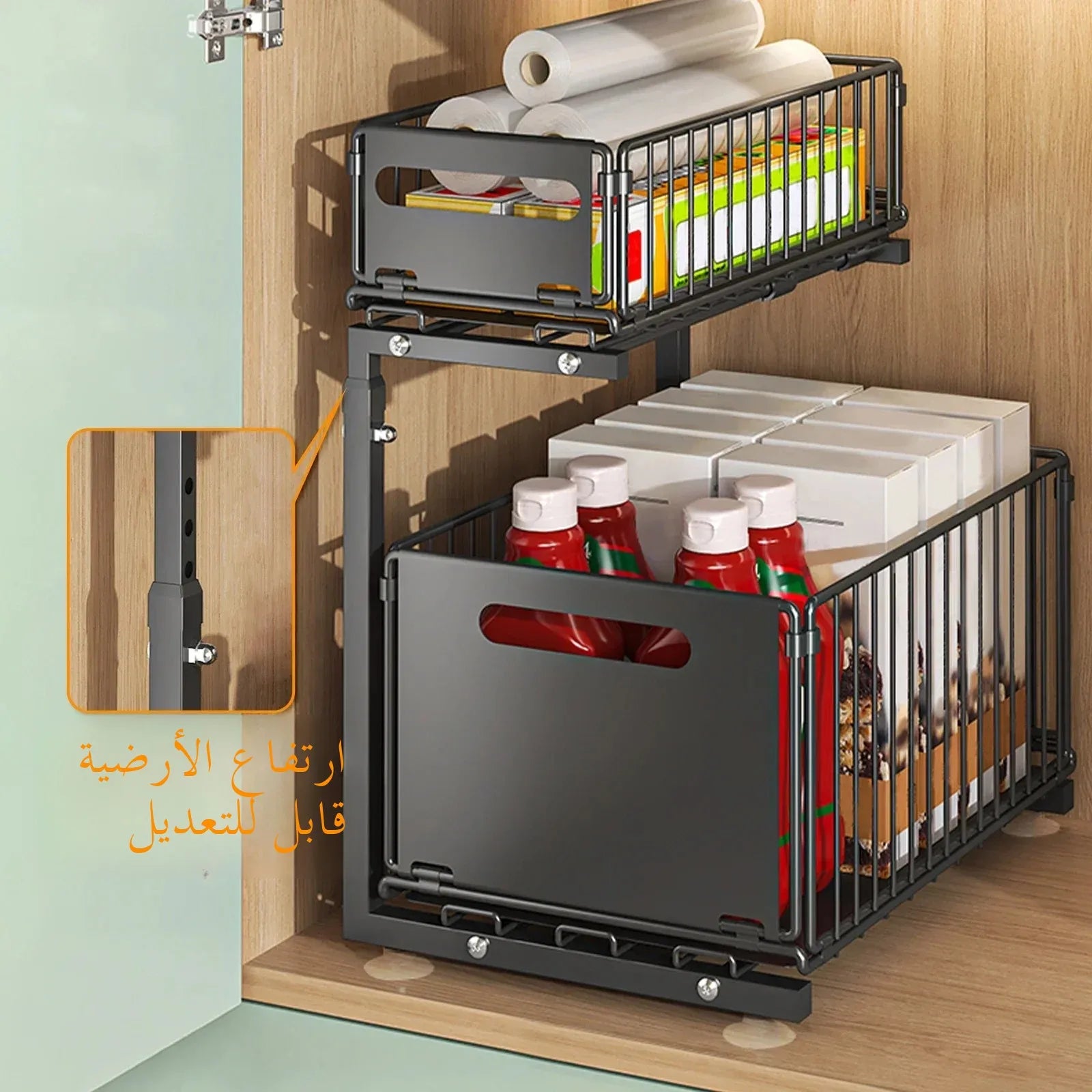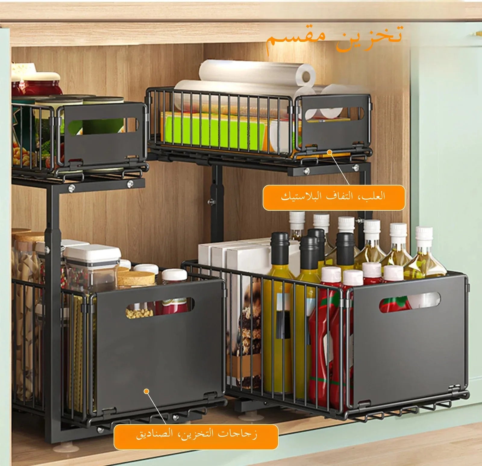منظم تخزين من طبقتين أسفل الحوض، سلة تخزين خزانة منزلقة قابلة للتعديل، رف تخزين للمطبخ مع أكواب شفط، كابينة قابلة للسحب